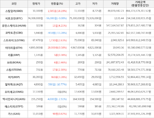 또한, 휴먼스케이프(4.21%, 322원), 어거(3.28%, 30,200원), 스트라이크(2.63%, 67,470원), 보라(2.46%, 250원), 스팀(2.38%, 731원), 가스(0.82%, 11,010원), 이더리움(0.58%, 4,895,000원), 리플(0.38%, 1,335원)이 상승세를 나타냈다.