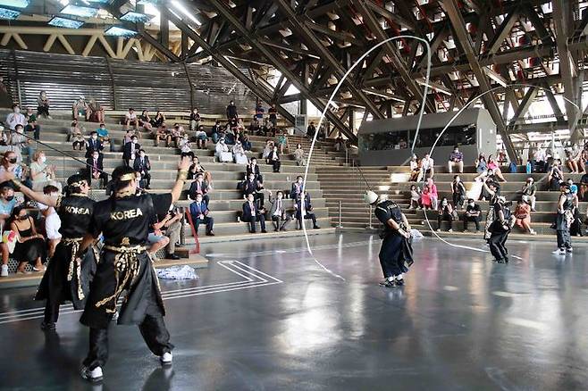 [서울=뉴시스] 조수정 기자 = 문승욱 산업통상자원부 장관이 손수득 KOTRA 부사장, 박정욱 부산엑스포유치위원회 사무총장, 김윤일 부산시 부시장 등과 함께 23일 오전(현지시간) UAE 두바이 엑스포 전시장에서 두바이 엑스포 한국관을 찾아 공연을 보고 있다. (사진=산업통상자원부 제공) 2021.10.23. photo@newsis.com *재판매 및 DB 금지