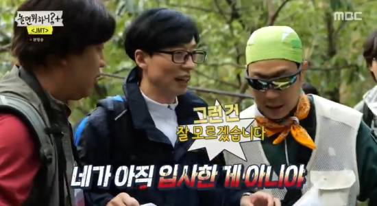 유재석은 "신입 사원분들하고만 한 장 찍겠다"라며 제안했고, 하하는 "버릇 나빠진다"라며 만류했다. 결국 유재석은 "왜 이렇게 싸가지 없어졌냐"라며 돌직구를 날렸다.