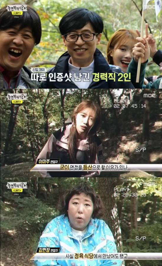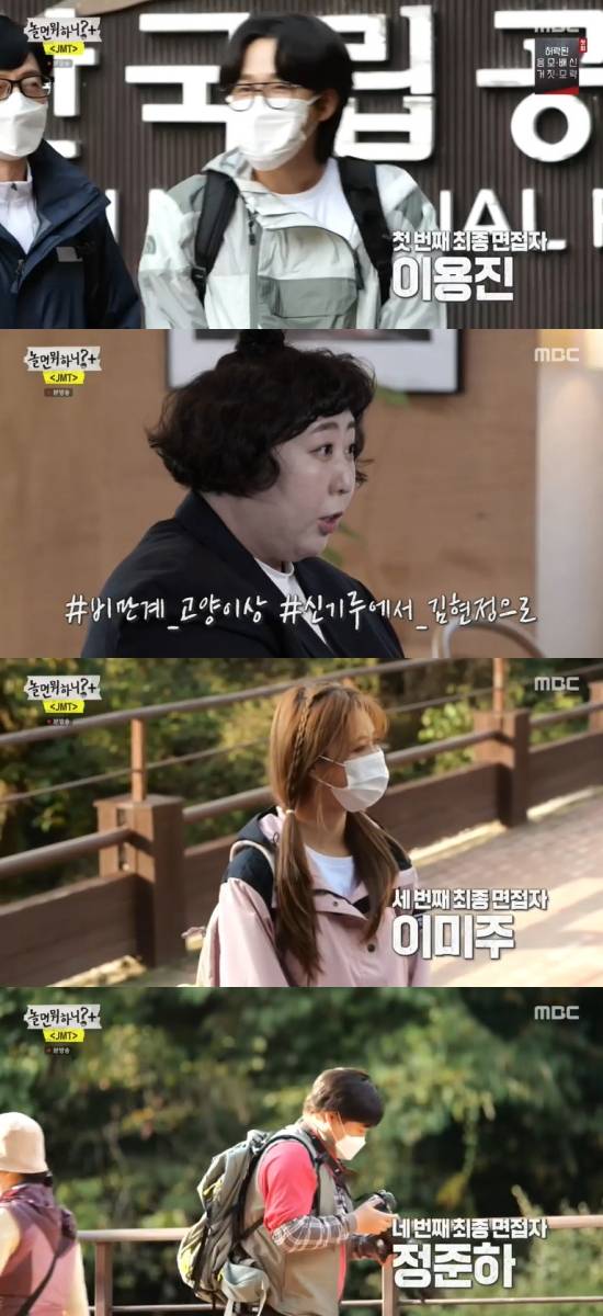 이날 유재석은 "오늘은 아주 특별히 면접자들의 긴장도 풀어주고 기분도 전환시켜 줄 겸 가볍게 등산으로 면접을 시작해 보려 한다"라며 기대했다. 이어 최종 면접에 오른 이용진, 신기루, 미주, 정준하, 하하, 이은지가 등장했다.