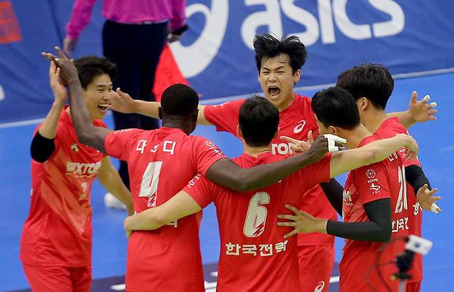 [서울=뉴시스] 조수정 기자 = 23일 수원 체육관에서 열린 도드람 2021-2022 V-리그 한국전력과 KB와의 경기, 한국전력 선수들이 환호하고 있다. (사진=한국전력 배구단 제공) 2021.10.23. photo@newsis.com