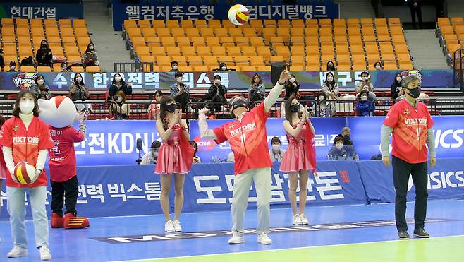 [서울=뉴시스] 조수정 기자 = 23일 수원 체육관에서 열린 도드람 2021-2022 V-리그 한국전력과 KB와의 경기, 한국전력공사 정승일 사장이 시구하고 있다. (사진=한국전력 배구단 제공) 2021.10.23. photo@newsis.com