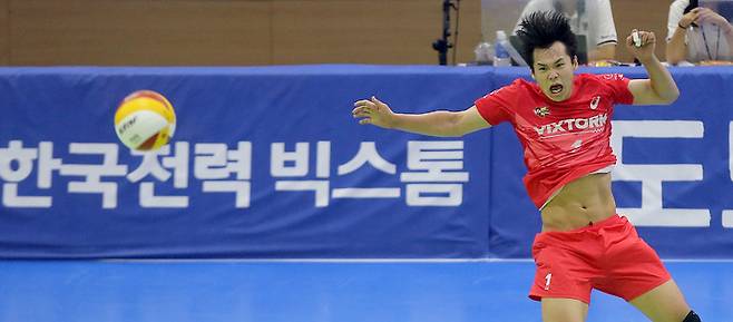 [서울=뉴시스] 조수정 기자 = 23일 수원 체육관에서 열린 도드람 2021-2022 V-리그 한국전력과 KB와의 경기, 한국전력 서재덕이 서브하고 있다. (사진=한국전력 배구단 제공) 2021.10.23. photo@newsis.com