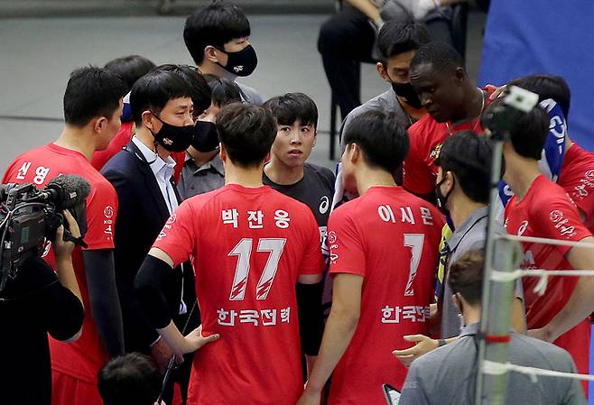 [서울=뉴시스] 조수정 기자 = 23일 수원 체육관에서 열린 도드람 2021-2022 V-리그 한국전력과 KB와의 경기, 한국전력 장병철 감독이 작전타임 하고 있다. (사진=한국전력 배구단 제공) 2021.10.23. photo@newsis.com *재판매 및 DB 금지