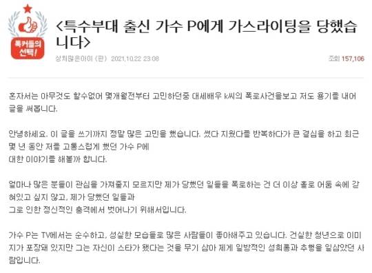 23일 온라인 커뮤니티 네이트 판에 '특수부대 출신 가수 P에게 가스라이팅을 당했습니다'라는 제목의 글이 올라왔다.