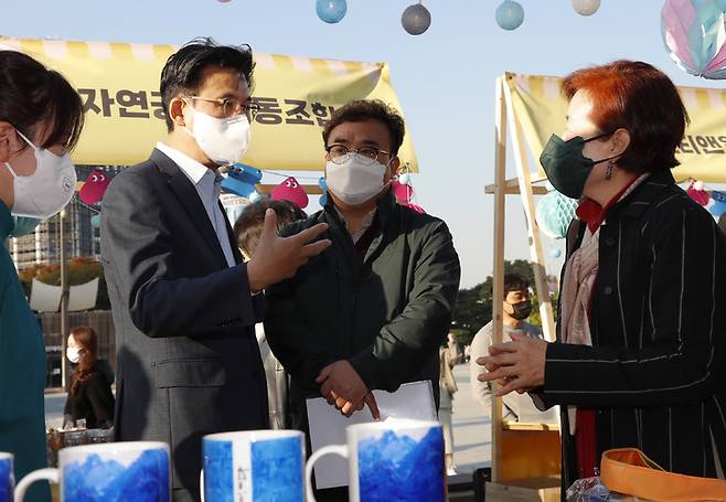 [서울=뉴시스] 조수정 기자 = 박성수 서울 송파구청장이 23일 오후 올림픽공원 평화의문 광장에서 열린 송파 사회적경제 장터 '송사장&사회적경제 놀자! ' 행사를 찾아 사회적경제 기업인을 격려 하고 있다. (사진=송파구 제공) 2021.10.23. photo@newsis.com *재판매 및 DB 금지