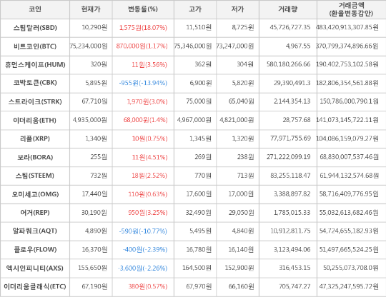 또한, 보라(4.51%, 255원), 휴먼스케이프(3.56%, 320원), 어거(3.25%, 30,190원), 스트라이크(3.0%, 67,710원), 스팀(2.52%, 732원), 이더리움(1.4%, 4,935,000원), 리플(0.75%, 1,340원), 오미세고(0.63%, 17,440원), 이더리움클래식(0.57%, 67,190원)이 상승세를 나타냈다.