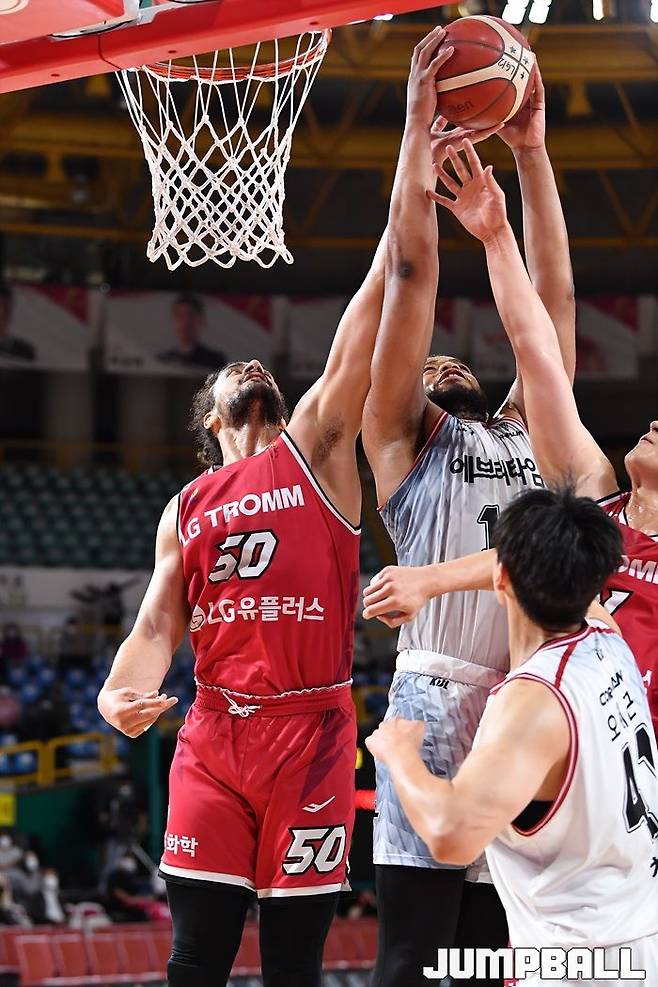 23일 창원실내체육관에서 열린 2021-2022 KGC인삼공사 정관장 프로농구 창원 LG와 안양 KGC인삼공사의 경기, KGC인삼공사 스펠맨이 리바운드를 경합하고 있다.