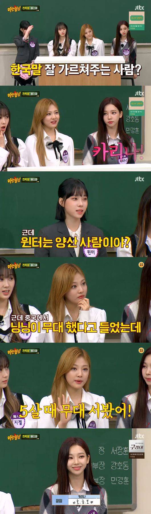 김희철은 닝닝에게 "멤버들 중에 한국어를 잘 가르쳐 준 사람이 누구인가"라고 물었다. 닝닝은 "카리나 언니가 잘 가르쳐준다"라고 말했다. 카리나는 "내가 설명해주는 걸 좋아해서 그런 것 같다. '야들야들하다'라는 느낌을 설명할 때 차돌박이를 처음 먹었을 때 느낌이라고 이야기했다"라고 말했다.