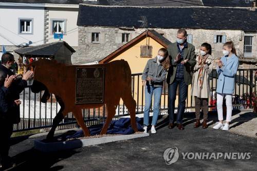 epa09541130 Spain's King Felipe (2-L), Queen Letizia (2-R), Leonor, Princess of Asturias (L) and Infanta Sofia (R) applaud after Leonor unveiled a commemorative plaque as they visit Santa Maria del Puerto village in Asturias region, Spain, 23 October 2021, a day after the Princess of Asturias Awards ceremony. Santa Maria del Puerto won this year's Exemplary Town of Asturias Award presented annually by the Princess of Asturias Foundation. EPA/Ballesteros