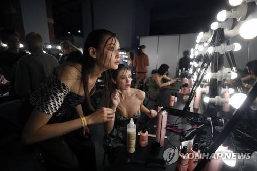 epa09541289 Models backstage prepare for a show during the Mercedes-Benz Fashion Week Russia, in Moscow, Russia, 23 October 2021. The fashion week runs from 19 to 23 October 2021. EPA/MAXIM SHIPENKOV