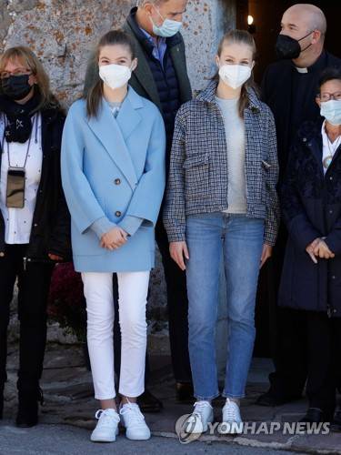 epa09541320 Spain's King Felipe (C, back), Leonor, Princess of Asturias (2-R) and Infanta Sofia (2-L) visit Santa Maria del Puerto village in Asturias region, Spain, 23 October 2021, a day after the Princess of Asturias Awards ceremony. Santa Maria del Puerto won this year's Exemplary Town of Asturias Award presented annually by the Princess of Asturias Foundation. EPA/Ballesteros