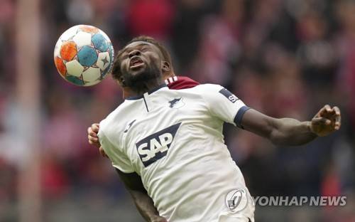 Bayern's Lucas Hernandez, left, challenges for the ball with Hoffenheim's Ihlas Bebou during the German Bundesliga soccer match between Bayern Munich and TSG 1899 Hoffenheim at the Allianz Arena stadium in Munich, Germany, Saturday, Oct. 23, 2021. (AP Photo/Matthias Schrader)