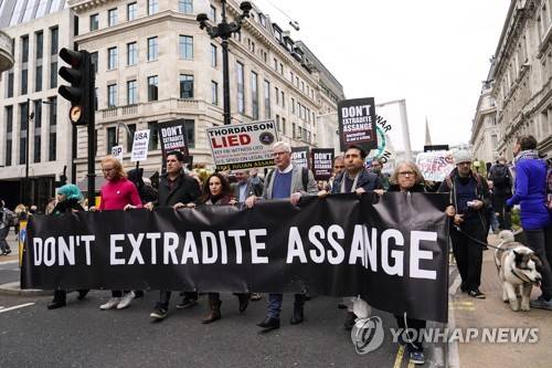 Julian Assange's partner Stella Morris, fourth left, and Wikileaks editor-in-chief Kristin Hrafnsson, fifth left, with supporters of WikiLeaks founder Julian Assange hold placards and take part in a march in London, Saturday, Oct. 23, 2021, ahead of next week's extradition case appeal. (AP Photo/Alberto Pezzali)