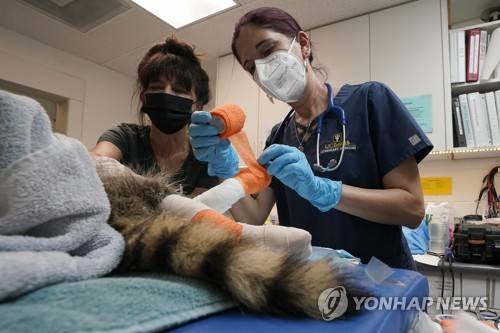 Veterinarian Jamie Peyton, right, puts bandages on the burned paws of a raccoon, with the help of Dana Fasolette, a volunteer at the Gold Country Rescue in in Auburn, Calif., Saturday, Oct. 2, 2021. As wildfires die down in the far western United States, wildlife centers are still caring for animals that were injured or unable to flee the flames. (AP Photo/Rich Pedroncelli)