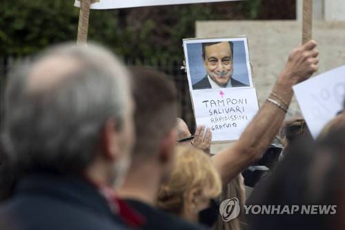 epa09541468 People hold placards during a protest against the Green pass in Ugo La Malfa square, Rome, Italy, 23 October 2021. The Italian government decided that starting 15 October Italian workers from the public and private sectors were required to hold the 'Green Pass' vaccine passport to access work places, sparking several protests. EPA/MASSIMO PERCOSSI