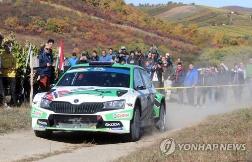 epa09541463 Andreas Mikkelsen of Norway and Elliott Edmondson of Britain drive their Skoda Fabia Rally2 Evo during the Rally Hungary as part of the FIA European Rally Championship near Mad, Hungary, 22 October 2021. EPA/Janos Vajda HUNGARY OUT