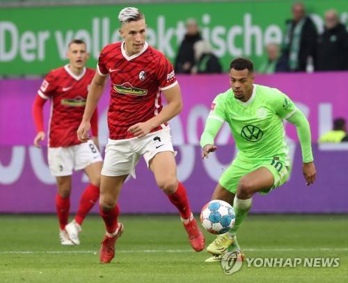 epa09541481 Freiburg's Nico Schlotterbeck (L) in action against Wolfsburg's Lukas Nmecha (R) during the German Bundesliga soccer match between VfL Wolfsburg and SC Freiburg in Wolfsburg, northern Germany, 23 October 2021. EPA/FOCKE STRANGMANN CONDITIONS - ATTENTION: The DFL regulations prohibit any use of photographs as image sequences and/or quasi-video.