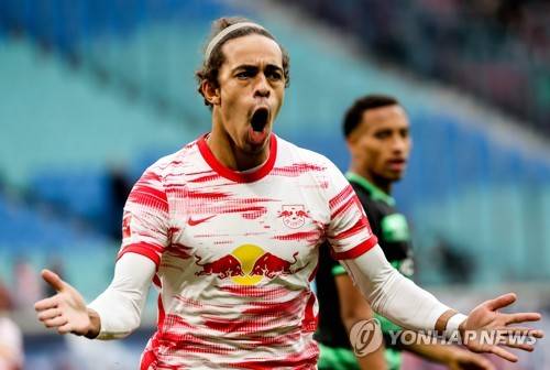 epa09541504 Leipzig's Yussuf Poulsen celebrates after scoring the 1-1 goal during the German Bundesliga soccer match between RB Leipzig and SpVgg Greuther Fuerth in Leipzig, Germany, 23 October 2021. EPA/FILIP SINGER CONDITIONS - ATTENTION: The DFL regulations prohibit any use of photographs as image sequences and/or quasi-video.