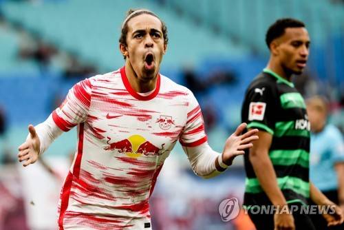 epa09541505 Leipzig's Yussuf Poulsen celebrates after scoring the 1-1 goal during the German Bundesliga soccer match between RB Leipzig and SpVgg Greuther Fuerth in Leipzig, Germany, 23 October 2021. EPA/FILIP SINGER CONDITIONS - ATTENTION: The DFL regulations prohibit any use of photographs as image sequences and/or quasi-video.