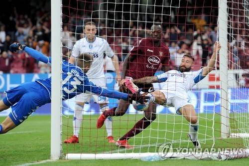 epa09541510 Empoli's goalkeeper Guglielmo Vicario (L) concedes an owngoal during the Italian Serie A soccer match US Salernitana vs Empoli FC at the Arechi stadium in Salerno, Italy, 23 October 2021. EPA/MASSIMO PICA