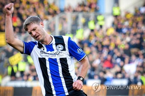 epa09541520 Arminia's Fabian Klos reacts during the German Bundesliga soccer match between DSC Arminia Bielefeld and Borussia Dortmund in Bielefeld, Germany, 23 October 2021. EPA/SASCHA STEINBACH CONDITIONS - ATTENTION: The DFL regulations prohibit any use of photographs as image sequences and/or quasi-video.
