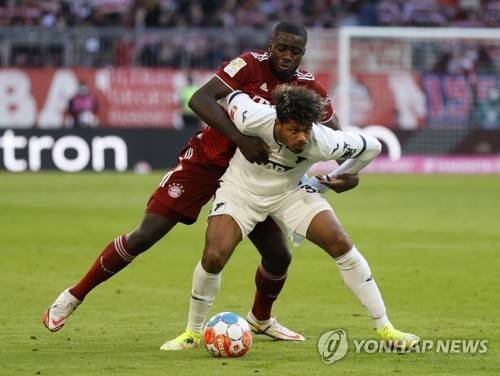 epa09541522 Munich's Dayot Upamecano (L) in action against Hoffenheim's Georginio Rutter (R) during the German Bundesliga soccer match between FC Bayern Munich and TSG 1899 Hoffenheim in Munich, Germany, 23 October 2021. EPA/RONALD WITTEK CONDITIONS - ATTENTION: The DFL regulations prohibit any use of photographs as image sequences and/or quasi-video.