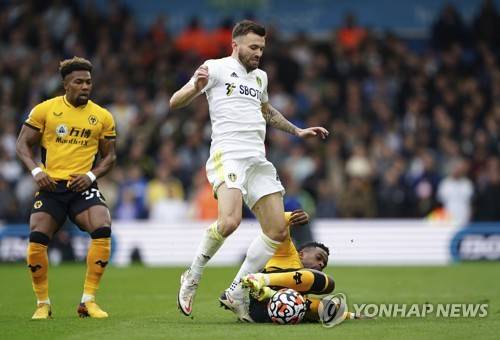 Leeds United's Stuart Dallas centre and Wolverhampton Wanderers' Nelson Semedo battle for the ball, during the English Premier League soccer match between Leeds United and Wolverhampton Wanderers, at Elland Road, in Leeds, Saturday, Oct. 23, 2021. (Zac Goodwin/PA via AP) UNITED KINGDOM OUT NO SALES NO ARCHIVE PHOTOGRAPH CANNOT BE STORED OR USED FOR MORE THAN 14 DAYS AFTER THE DAY OF TRANSMISSION