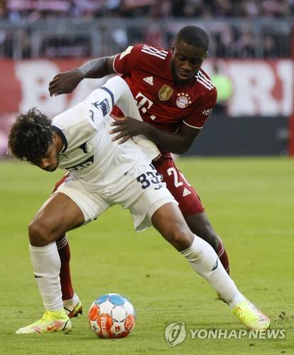 epa09541528 Munich's Dayot Upamecano (R) in action against Hoffenheim's Georginio Rutter (L) during the German Bundesliga soccer match between FC Bayern Munich and TSG 1899 Hoffenheim in Munich, Germany, 23 October 2021. EPA/RONALD WITTEK CONDITIONS - ATTENTION: The DFL regulations prohibit any use of photographs as image sequences and/or quasi-video.