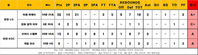 반면 LG 1옵션 아셈 마레이는 올 시즌 최고 활약을 펼쳤음에도 팀 패배에 또다시 좌절했다.