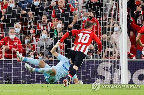 epa09542258 Athletic's striker Iker Muniain (R) celebrates after scoring the 2-1 by penalty during the Spanish LaLiga soccer match between Athletic Club de Bilbao and Villarreal CF at San Mames stadium in Bilbao, Basque Country, Spain, 23 October 2021. EPA/Luis Tejido