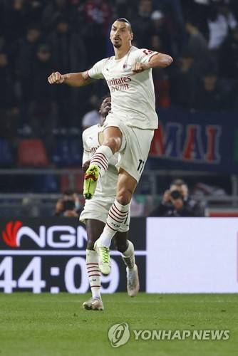 epa09542273 Milan's Zlatan Ibrahimovic celebrates after scoring the 4-2 lead during the Italian Serie A soccer match between Bologna FC and AC Milan at Renato Dall'Ara stadium in Bologna, Italy, 23 October 2021. EPA/ELISABETTA BARACCHI