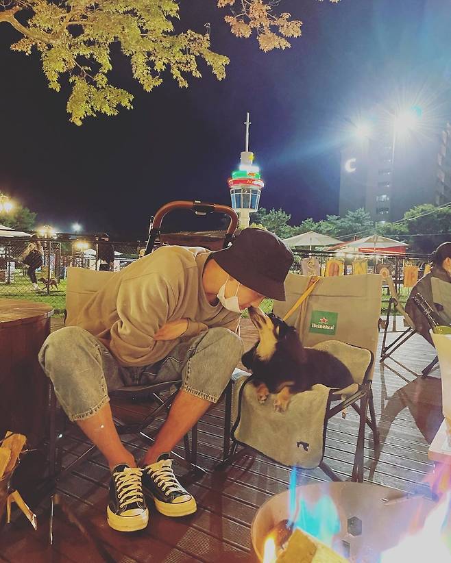 공개된 사진 속 정경호는 모닥불 앞에서 반려견과 함께 뽀뽀를 하는 모습이다.