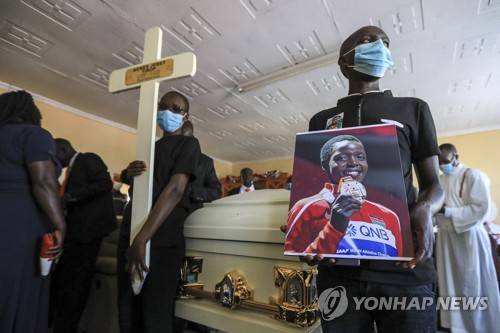 epaselect epa09542088 Family and relatives to the late Kenyan long-distance runner and Olympian Agnes Tirop conduct a prayer session standing next to her coffin inside her parents house before proceeding to her funeral service at her parent?s home, at Kapnyamisa village, in Nandi County, Kenya, 23 October 2021. Agnes Tirop (25) a double world championships medallist in the 10,000m, and fourth in the 5,000m race during Olympic Games in Tokyo 2020, was found stabbed at her home in Iten on 13 October 2021. Tirop's partner, who is allegedly suspected to have committed the murder, has since been arrested. Tirop's family demands justice for their daughter. EPA/DANIEL IRUNGU