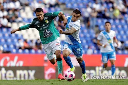 epa09542338 Leon's Osvaldo Rodriguez (L) vies for the ball with Christian Tabo (R) of Club Puebla during a 15th date of the 2021 Mexican Soccer League MX Opening Tournament match, at the Cuauhtemoc stadium in the city of Puebla, Mexico, 23 October 2021 EPA/Hilda Rios