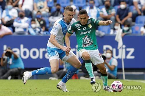 epa09542362 Leon's Angel Mena (R) vies for the ball with Lucas Jaques (L) of Club Puebla during a 15th date of the 2021 Mexican Soccer League MX Opening Tournament match, at the Cuauhtemoc stadium in the city of Puebla, Mexico, 23 October 2021. EPA/Hilda Rios