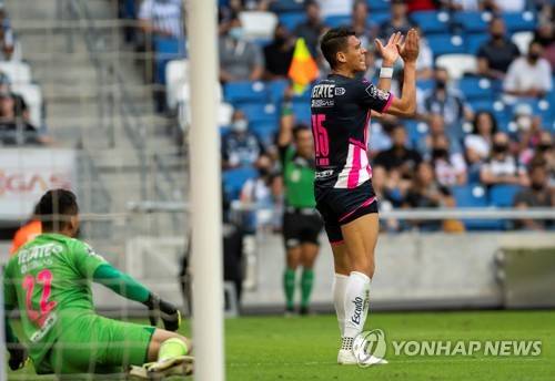epa09542388 Hector Moreno (R) of Monterrey claims a play against Necaxa during the Liga MX 2021 Apertura Tournament socer match between Monterrey and Necaxa at the BBVA Stadium, in Guadalupe, Mexico, 23 October 2021. EPA/Miguel Sierra