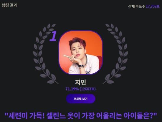 지민은 전체 17,703명이 참여한 이번 투표에서 12,603명의 선택을 받아 약 71.19%의 지지율로 1위를 차지했다.