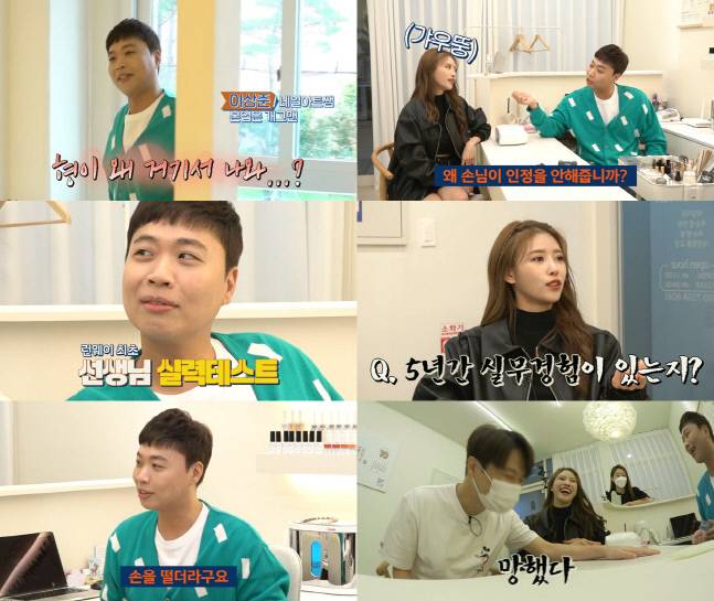 의심 속에 네일아트 배우기에 도전한 이미주는 예상보다 뛰어난 손재주로 네일아트 지니어스로 등극, 선생님인 이상준과 막상막하 네일 공방전을 펼치며 재미를 줄 예정이다. 네일아트 첫 도전임에도 불구하고 깔끔하게 손톱 소독과 관리에 성공한 이미주의 실력에 이상준도 고개를 끄덕이며 인정을 외칠 수밖에 없었다고. 수업이 진행될수록 실력이 일취월장하는 이미주와 달리 이상준은 “네일용 니퍼가 없으면 철사용 니퍼를 써라” “네일샵에 온 손님들이 싸우면 못 들은 척하고 관리만 하라” 등의 기상천외한 노하우들을 대방출하며, 네일아트보다는 본업인 개그에 특화된 수업을 펼친다. 더욱이 이상준은 젤네일 시술을 하던 중 이미주에게까지 지적을 당하며 스승과 제자가 뒤바뀐 듯한 톰과 제리 케미로 폭소를 낳았다.