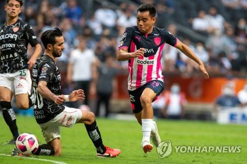 epa09542476 Carlos Rodriguez (R) of Monterrey in action against Luis Quintana (L) of Necaxa during the Liga MX 2021 Apertura Tournament socer match between Monterrey and Necaxa at the BBVA Stadium, in Guadalupe, Mexico, 23 October 2021. EPA/Miguel Sierra