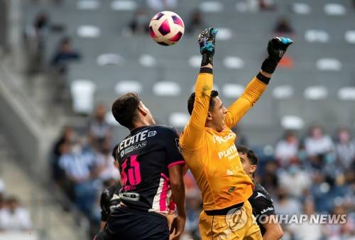 epa09542477 Alan Montes (L) of Monterrey in action against goalkeeper Luis Malagon (R) of Necaxa during the Liga MX 2021 Apertura Tournament socer match between Monterrey and Necaxa at the BBVA Stadium, in Guadalupe, Mexico, 23 October 2021. EPA/Miguel Sierra