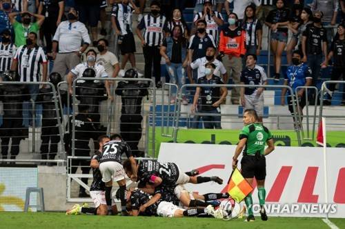 epa09542479 Necaxa players celebrate a goal against Monterrey during the Liga MX 2021 Apertura Tournament socer match between Monterrey and Necaxa at the BBVA Stadium, in Guadalupe, Mexico, 23 October 2021. EPA/Miguel Sierra