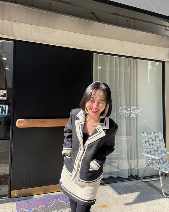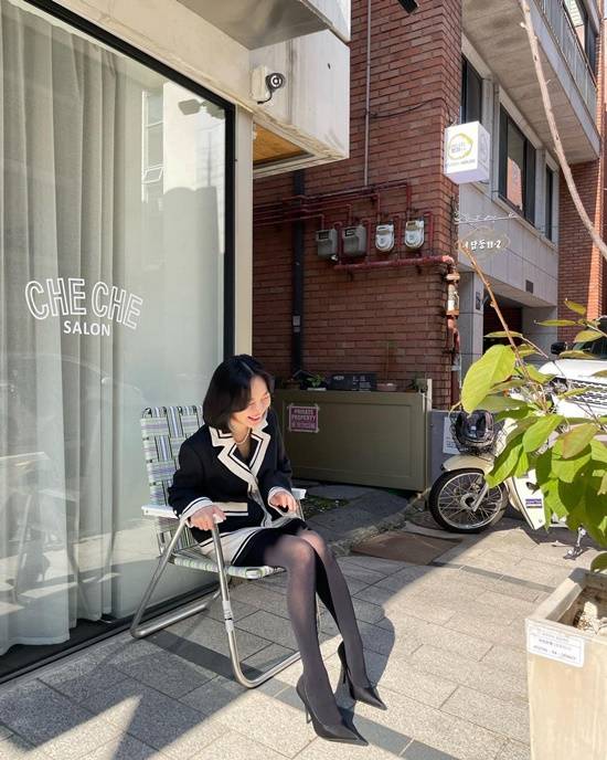 공개된 사진 속 자두는 블랙 앤 화이트의 단정한 스타일 투피스와 블랙 하이힐을 매치해 단아한 비주얼을 완성한 모습.