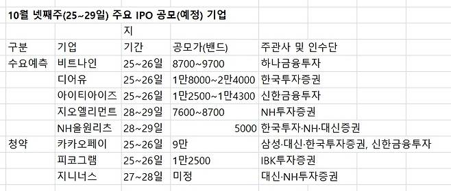 24일 금융투자업계에 따르면 이번주(25~29일) 수요예측을 진행하는 기업은 비트나인, 디어유, 아이티아이즈, 지오엘리먼트, NH올원리츠 등 5곳이다. 카카오페이와 피코그램, 지니너스는 일반 공모청약을 실시한다.