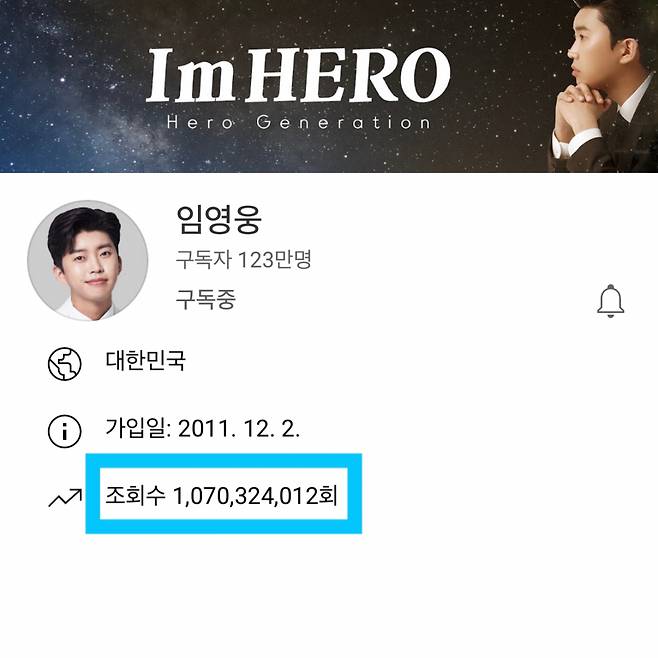 구독자 123만 명의 임영웅 공식 유튜브 채널 '임영웅'은 10월 24일 총 조회수 10억 7000만 뷰를 달성했다.