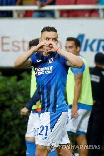 epa09542590 Jonathan Rodriguez (C) of Cruz Azul celebrates a goal during the Liga MX 2021 Apertura Tournament soccer match between Guadalajara and Cruz Azul at the Akron Stadium, in Zapopan, Mexico, 23 October 2021. EPA/Francisco Guasco
