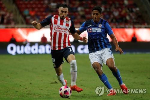 epa09542593 Manuel Mayorga (L) of Guadalajara in action against Luis Romo (R) of Cruz Azul during the Liga MX 2021 Apertura Tournament soccer match between Guadalajara and Cruz Azul at the Akron Stadium, in Zapopan, Mexico, 23 October 2021. EPA/Francisco Guasco
