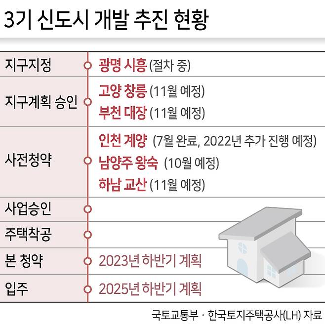 국토부 관계자는 “본 청약 지연이 발생하지 않도록 과거 보금자리주택사업과 달리 지구계획 등 인허가 절차와 토지 보상 절차를 동시에 진행하고 있다”며 “연내 보상금 지급 착수 등 사전청약은 물론 본 청약까지 계획대로 시행할 것”이라고 말했다. 정부는 내년 토지 보상을 마무리하고 부지 조성공사에 착수해 2023년부터는 순차적으로 본 청약을 시행하겠다는 방침이다.