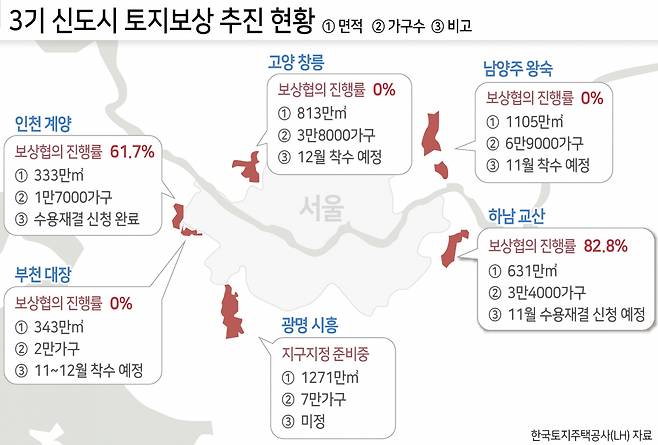 다른 두 곳의 상황도 순조롭지만은 않다. 인천 계양과 하남 교산은 지난 6월 보상 협의를 마무리했지만 이달 15일 기준 협의율이 각각 61.7%, 82.8%에 불과해 보상 완료까지는 시간이 더 필요하다. 인천 계양은 수용재결을 진행 중이고 하남 교산은 다음달부터 순차적으로 수용재결을 신청할 예정이다. LH는 내년 상반기까지 토지수용위원회의 승인을 받아 토지 소유권을 확보하겠다는 계획이다.