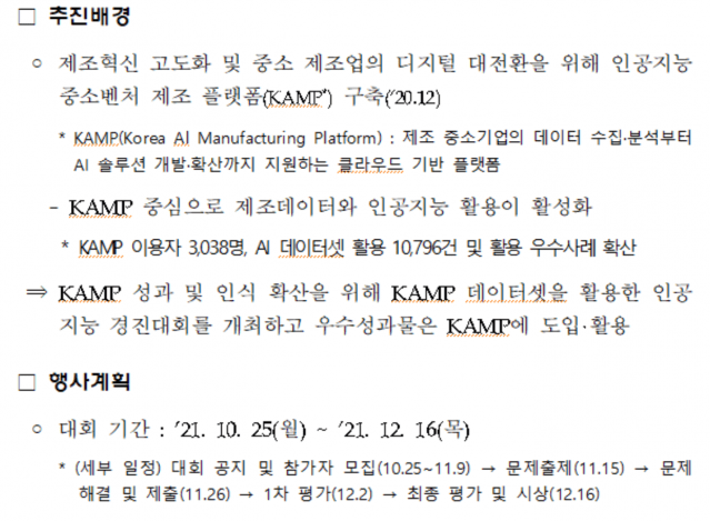 이번 대회의 과제는 KAMP 데이터셋을 활용해 중소 제조 현장의 문제를 해결할 수 있는 인공지능을 개발하는 것이다. 개발된 인공지능은 KAMP에 도입해 중소기업이 활용할 수 있도록 지원할 계획이다. 구체적인 과제는 11월 15일에 공개된다. 참가자는 11월 26일까지 과제에 따른 인공지능 분석모델을 개발해 결과물을 제출하면 된다.